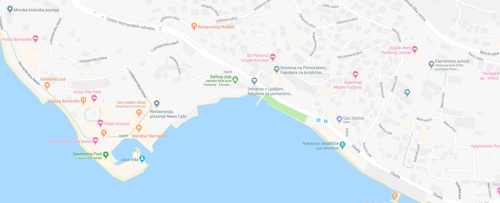 Na križišču pred strmim klancem proti Piranu zavijete na desno proti Fakulteti ali na levo, če želite parkirati ob morju, na bernardinskem parkirišču in se sprehoditi do Fakultete.